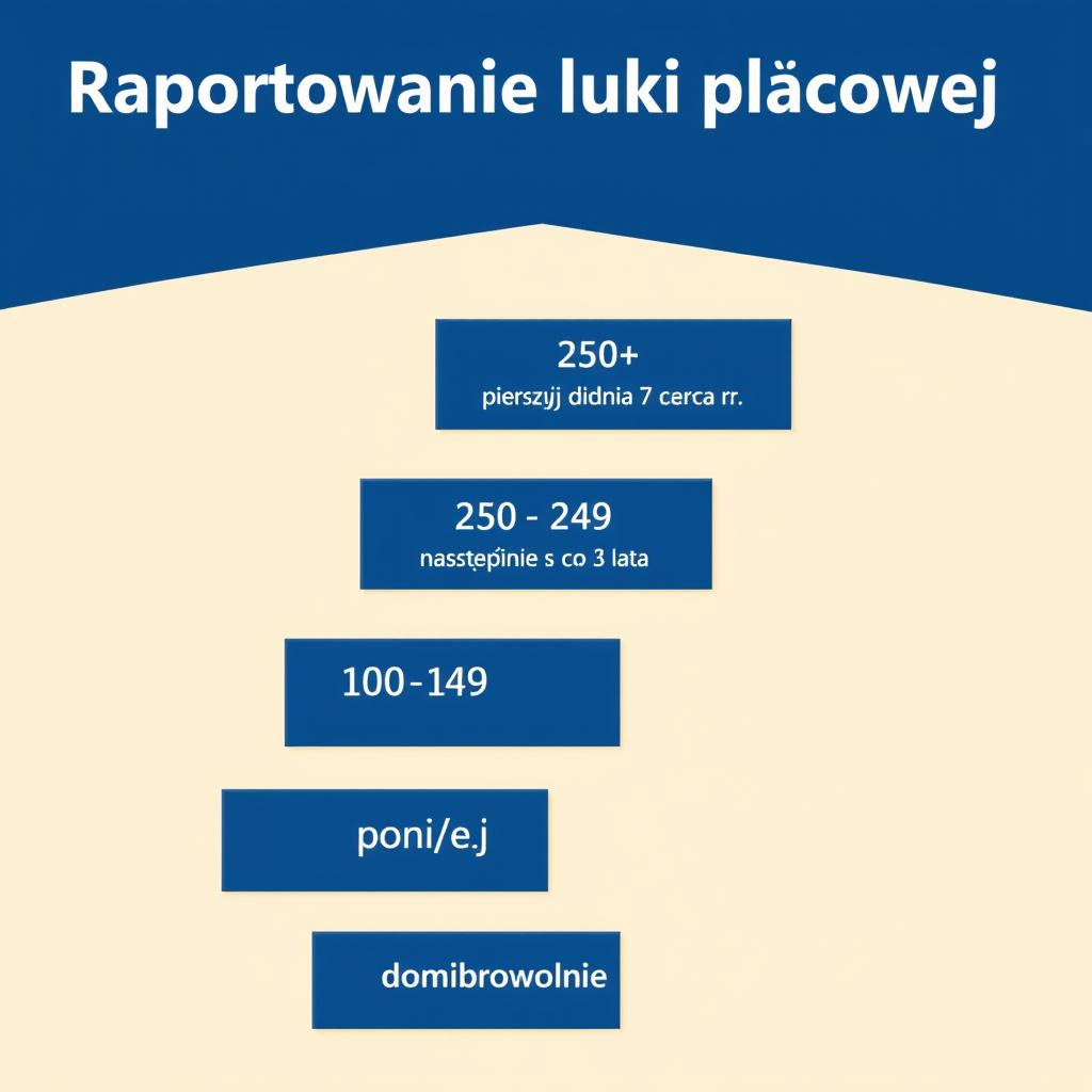 A flat design infographic in Polish, wide 21:9 format, beige background with dark blue blocks and text. Title at the top: "Raportowanie luki płacowej". Four horizontal blocks forming steps (like a staircase). Each block labeled with employee ranges and obligations: "250+" → "pierwszy raport do dnia 7 czerwca 2027 r., następnie co roku" "150–249" → "pierwszy raport do dnia 7 czerwca 2027 r., następnie co 3 lata" "100–149" → "pierwszy raport do dnia 7 czerwca 2031 r., następnie co 3 lata" "poniżej 100" → "dobrowolnie". Clean, minimal, modern style, with arrows pointing right from each block. Polish letters must be correct (ż, ą, ę).*ASPECT RATIO :1024 * 1024